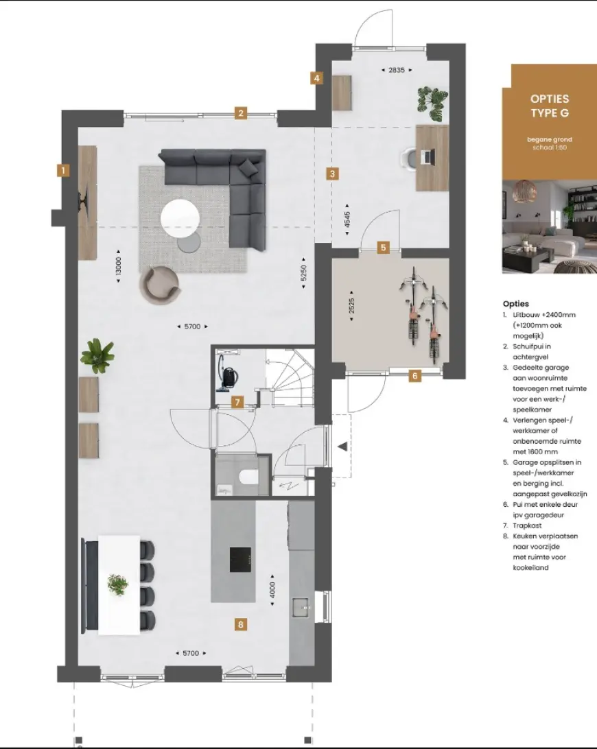 Er zijn volop mogelijkheden om deze woning naar jouw wensen aan te passen. Op de begane grond kun je kiezen voor een uitbouw van 1,20 of 2,40 meter, waarmee je direct meer leefruimte creëert. Wil je liever de keuken aan de voorzijde? Ook dat is mogelijk. Daarnaast kun je de garage verlengen en/of opsplitsen in een berging en een extra ruimte die je bij de woning betrekt – ideaal voor bijvoorbeeld een werkkamer, speelruimte of hobbyruimte.