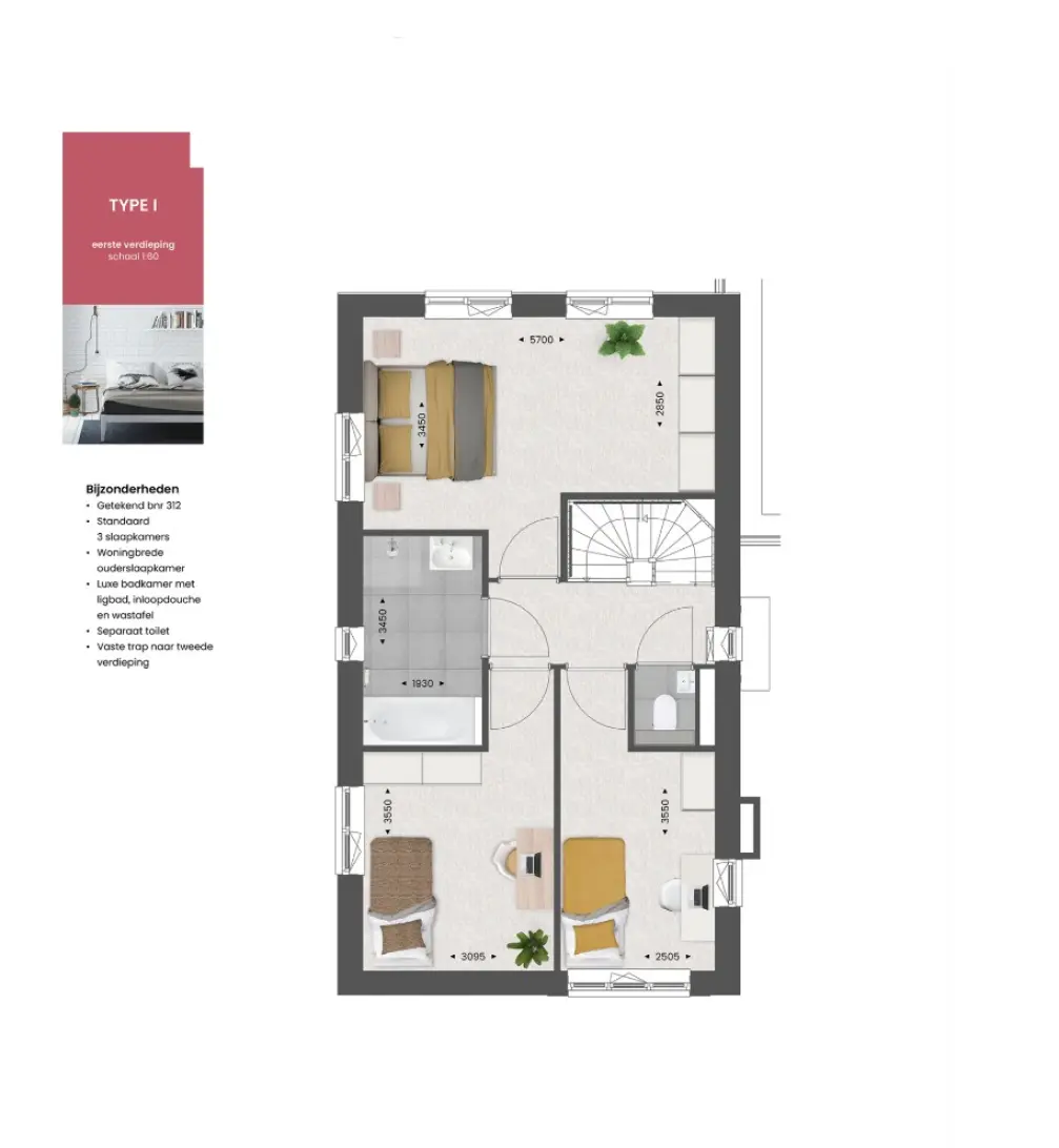 Ook de verdiepingen zijn naar wens in te delen. Op de eerste verdieping kun je de badkamer vergroten voor meer comfort, of twee slaapkamers samenvoegen tot één royale hoofdslaapkamer met bijv. een inloopkast. Op de tweede verdieping richt je met diverse indelingsopties een volwaardige woonlaag in, met bijvoorbeeld twee extra slaapkamers, een tweede badkamer en een praktische was-/bergruimte.