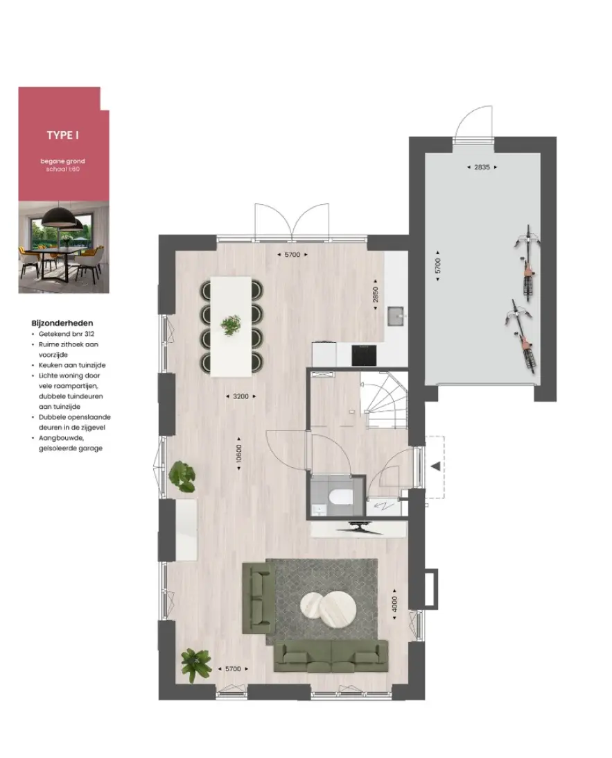 Er zijn volop mogelijkheden om deze woning naar jouw wensen aan te passen. Op de begane grond kun je kiezen voor een uitbouw van 1,20 of 2,40 meter, waarmee je direct meer leefruimte creëert. Wil je liever de keuken aan de voorzijde? Ook dat is mogelijk. Daarnaast kun je de garage verlengen en/of opsplitsen in een berging en een extra ruimte die je bij de woning betrekt – ideaal voor bijvoorbeeld een werkkamer, speelruimte of hobbyruimte.