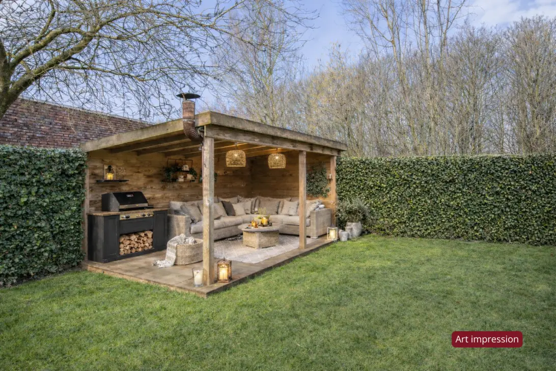 Exterieur: Genieten in de tuin, elk seizoen opnieuw. De achtertuin is een oase van rust: met een sfeervolle vijver, een zonneterras én een gezellige veranda. Of u nu ’s ochtends geniet van de eerste kop koffie in de zon, een boek leest in de schaduw van de veranda, of een zomerse borrel geeft met vrienden. Deze tuin voelt als een verlengstuk van uw woonkamer.