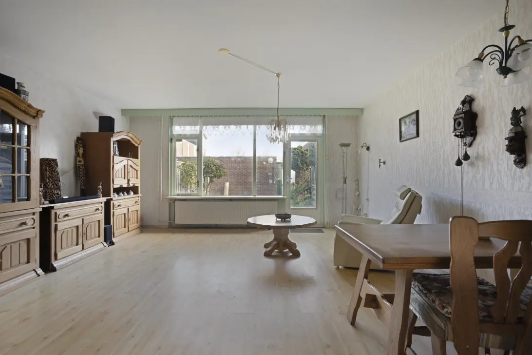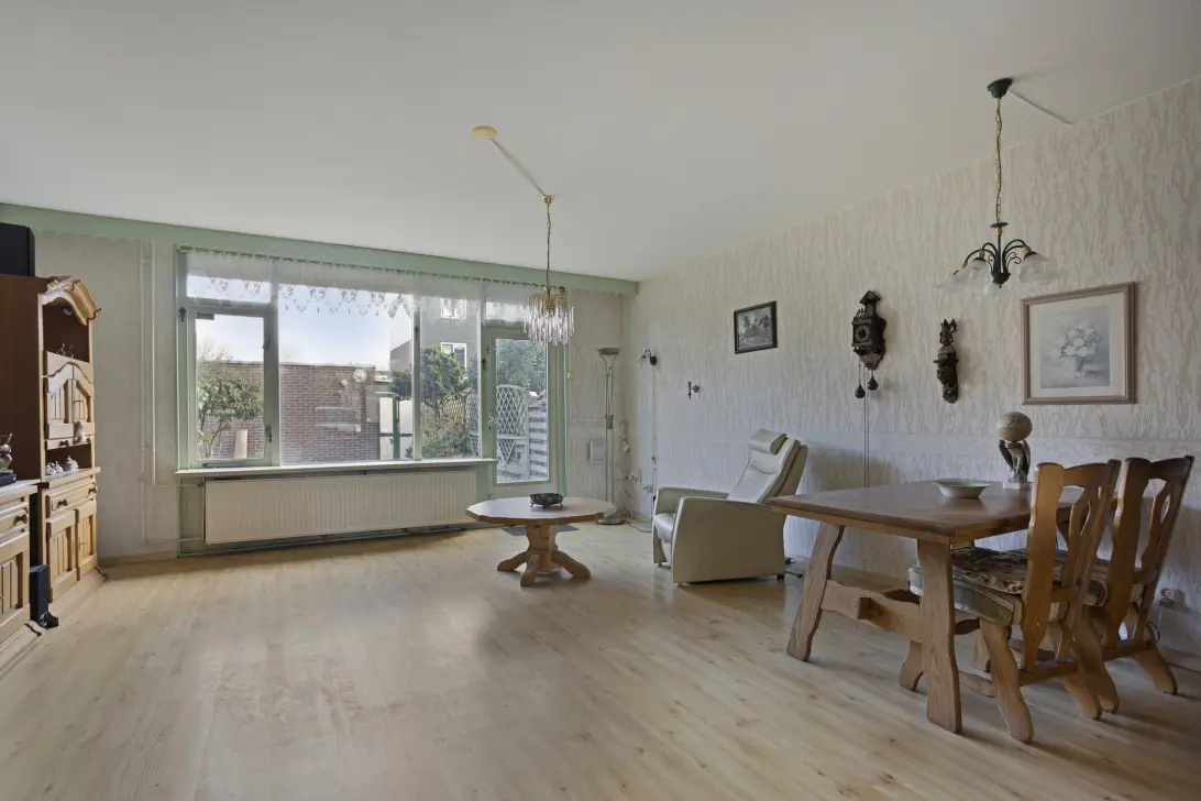 Je betreedt de woning via de hal met meterkast, toilet met fonteintje en trapopgang. Vanuit de hal stap je de lichte woonkamer binnen, gelegen aan de achterzijde van het huis. De grote raampartijen zorgen voor veel daglicht en bieden uitzicht op de tuin. Via de achterdeur heb je direct toegang tot de buitenruimte, waar ook een elektrisch rolluik is geplaatst voor extra comfort. De woonkamer is voorzien van een laminaatvloer en beschikt over een praktische trapkast voor extra opbergruimte.
