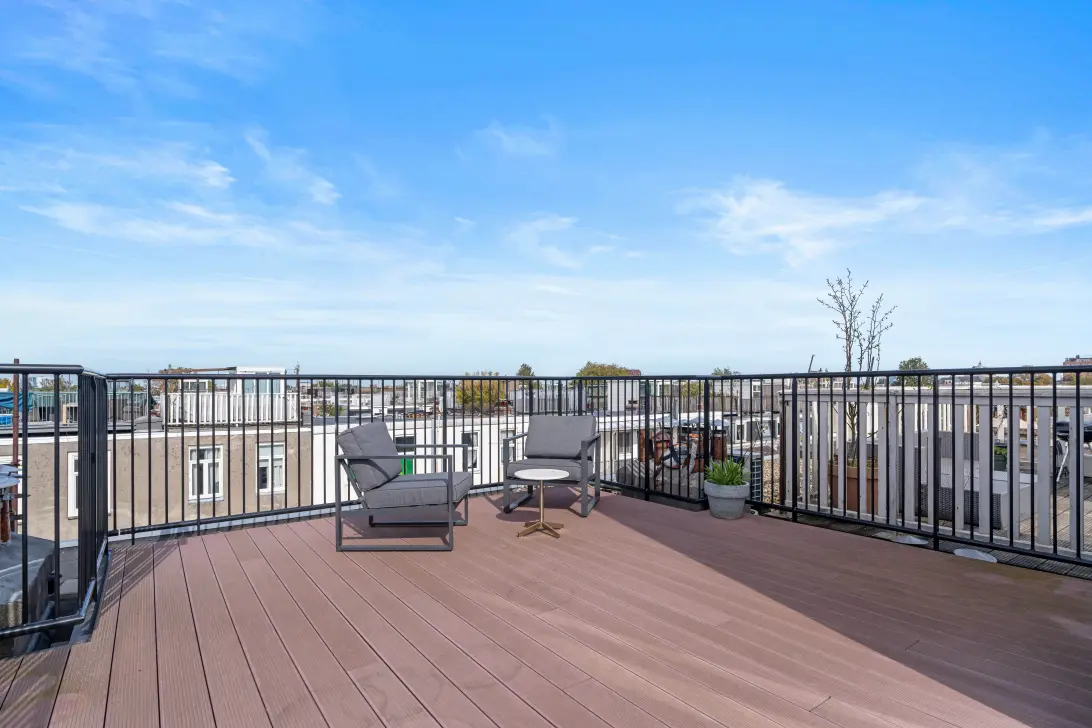 Via een interne trap bereik je het zonnige dakterras van ca 34 m² met eigen dakhuisje. Dit is de ultieme plek om heerlijk te ontspannen midden in de stad! Het terras is voorzien van een water- en elektra punt.