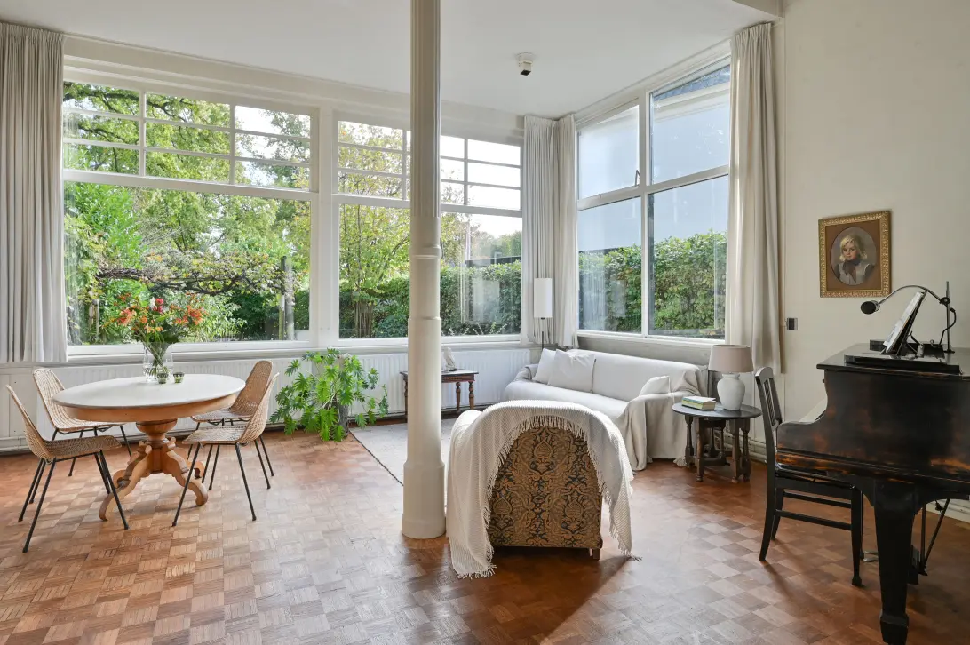 * Zeer ruime en sfeervolle woonkamer met hoog gedecoreerd plafond, serre aan de voorzijde en indrukwekkende raampartijen.