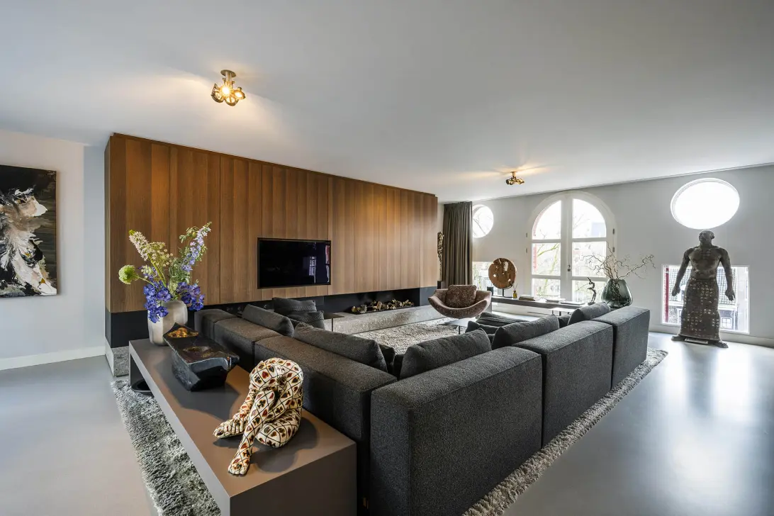 The living area is at the front, where large windows provide a stunning view over the canal and flood the space with daylight. This masterpiece by interior architect Remy Meijers boasts a unique aesthetic that captures attention immediately. A beautiful walnut-wood cabinet with a cozy, wide fireplace graces the living room.