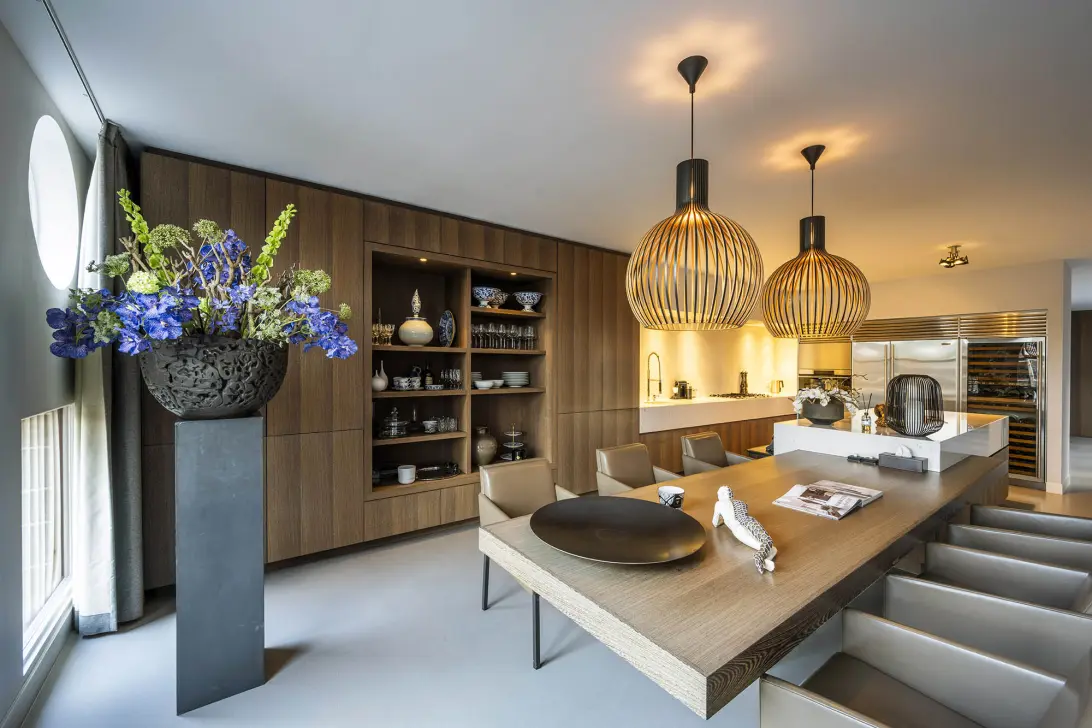 The kitchen island seamlessly transitions into the dining table, crafted from the same exquisite wood elements.