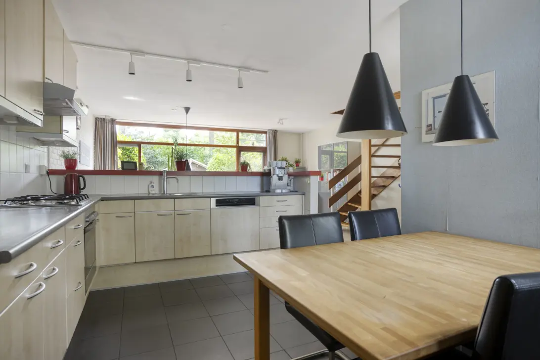 In de keuken, of eigenlijk eetkeuken, staat een ruime hoekopstelling in een rustige kleurstelling. De gaskookplaat, afzuigkap, combi-oven, vaatwasser, koelkast en vriezer zijn ingebouwd. Op de vloer liggen dezelfde tegels als de hal, en het uitzicht naar de voortuin is fraai.
