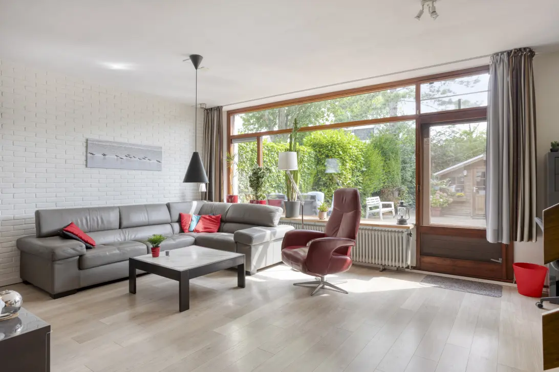 De tuingerichte woonkamer heeft een breedte van bijna 6 meter, met grote ramen aan de zonnige zuidkant. Omdat de eettafel in de halfopen keuken staat, kan de woonkamer geheel als zitkamer worden ingedeeld. Nu wordt een deel van de woonkamer als werkplek gebruikt, maar dat kan uiteraard ook in een van de slaapkamers boven.
