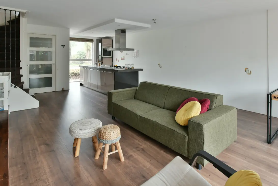 Je komt binnen in de hal die toegang geeft tot het toilet en de woonkamer. De woonkamer is een fijne plek om een comfortabele bank te plaatsen en uit te kijken op de tuin. Aan de voorzijde is de ruimte optimaal benut met een keukeneiland en een hoge keukenkast in de hoek waarin de koelkast en de oven zijn geplaatst. Vanuit het keukenraam kijk je uit op een brede laan.