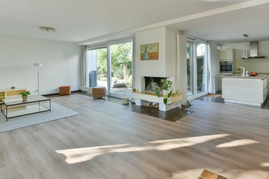You enter the house via the hall with cloak area and a luxury, wall-hung toilet with integrated bidet/cleansing function. The living area with open kitchen is best described as a ballroom of approximately 75 m², featuring a fireplace and beautiful natural light through the large side window and the additional windows in the front façade. A new PVC floor has been laid. Both the living room and the kitchen have sliding doors to the garden; the sliding door from the living room opens to the part of the garden with particularly favorable evening sun. The kitchen is fully equipped with built-in appliances, including an induction hob and an oven, and has a generous island. From the kitchen there is access to the utility room. The utility room has its own entrance from the front garden; here you will find the connections for a washing machine and dryer.