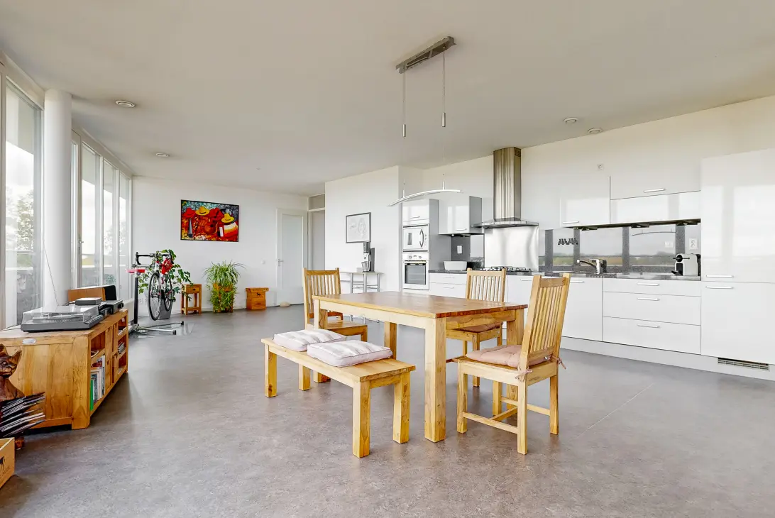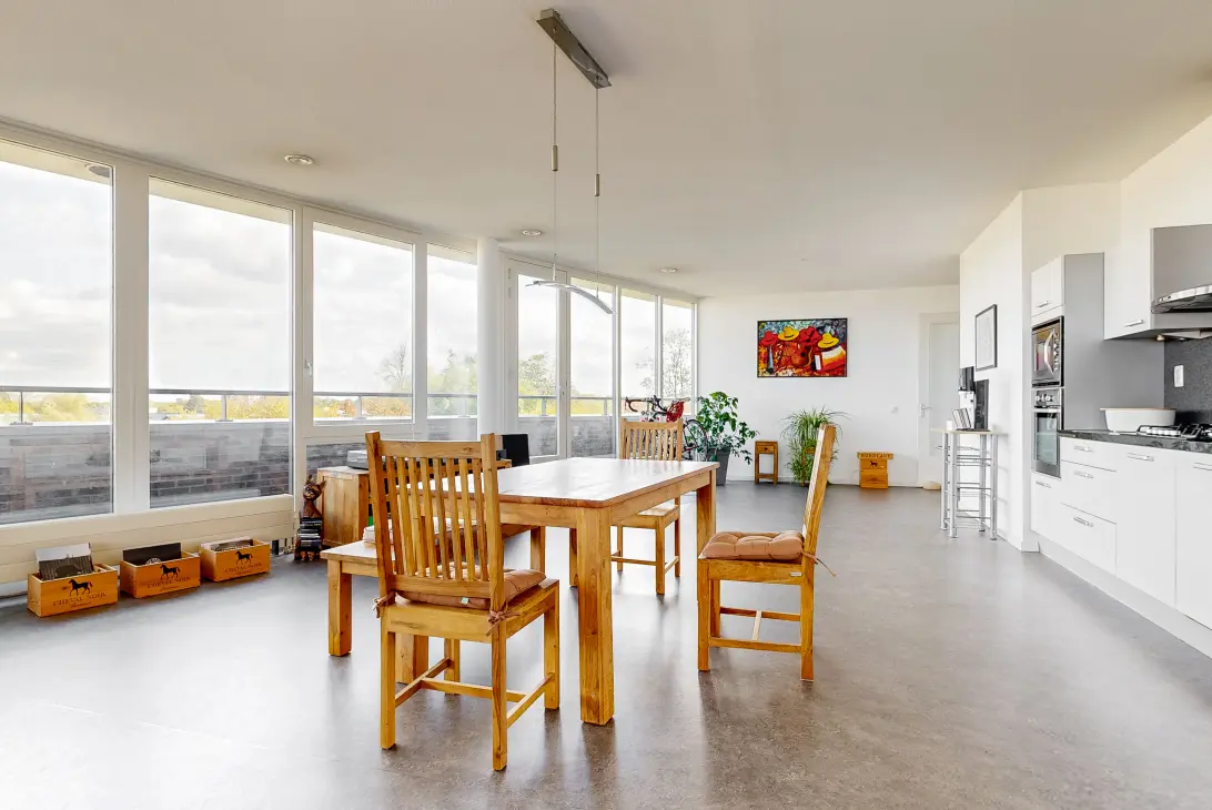 De woonkamer heeft grote raampartijen die voor veel lichtinval zorgen en bieden vrij uitzicht over de omgeving.