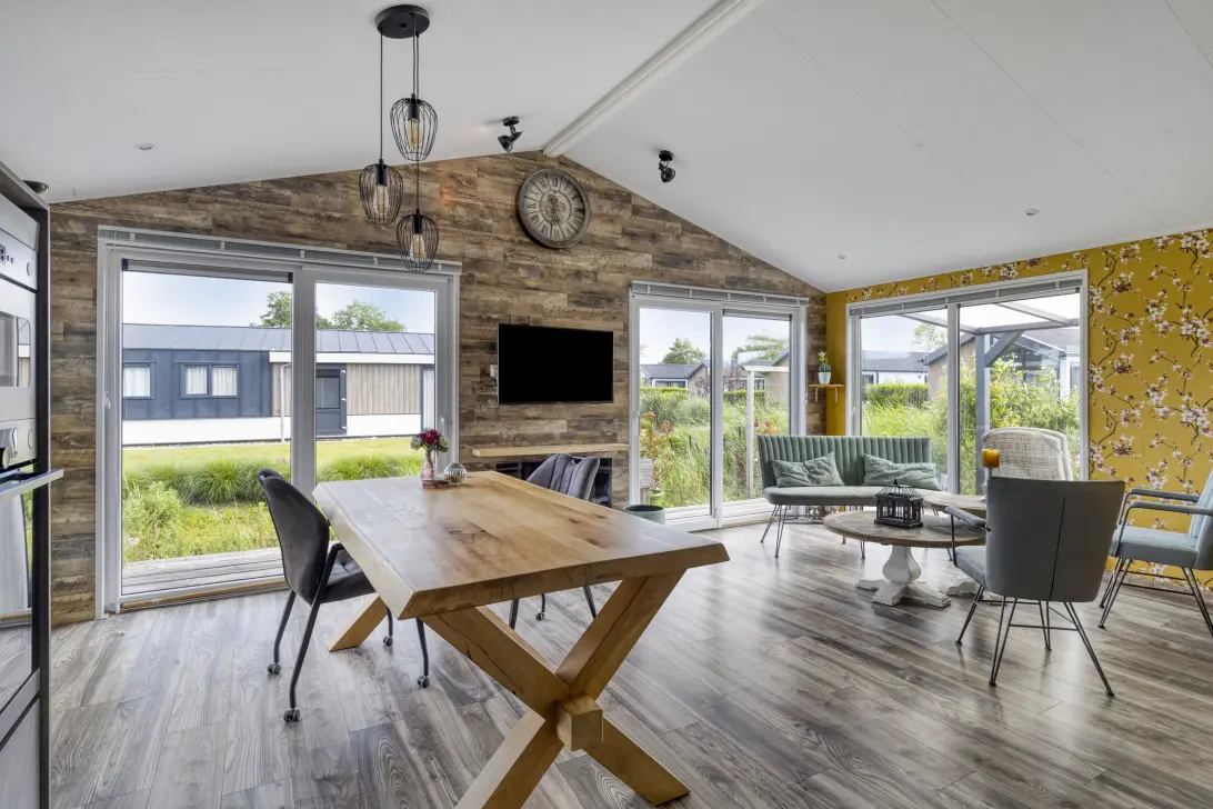 Dit prachtige moderne chalet wordt desgewenst gemeubileerd opgeleverd. De woonkamer is groot en lekker licht door dat er aan 3 kanten ramen zijn. U kijkt uit op de royale en prachtig aangelegd tuin. Zet de schuifpui open en haal buiten naar binnen. Het hoge plafond (met inbouwspots) met een nok van bijna 3 meter zorgt voor een ruimtelijk gevoel. Uiteraard is er verwarming en een airco aanwezig. De tv en sfeerhaard zijn perfect opgesteld zodat u zowel vanuit de zithoek onderuit kan genieten, maar hoog zitten kan ook.
