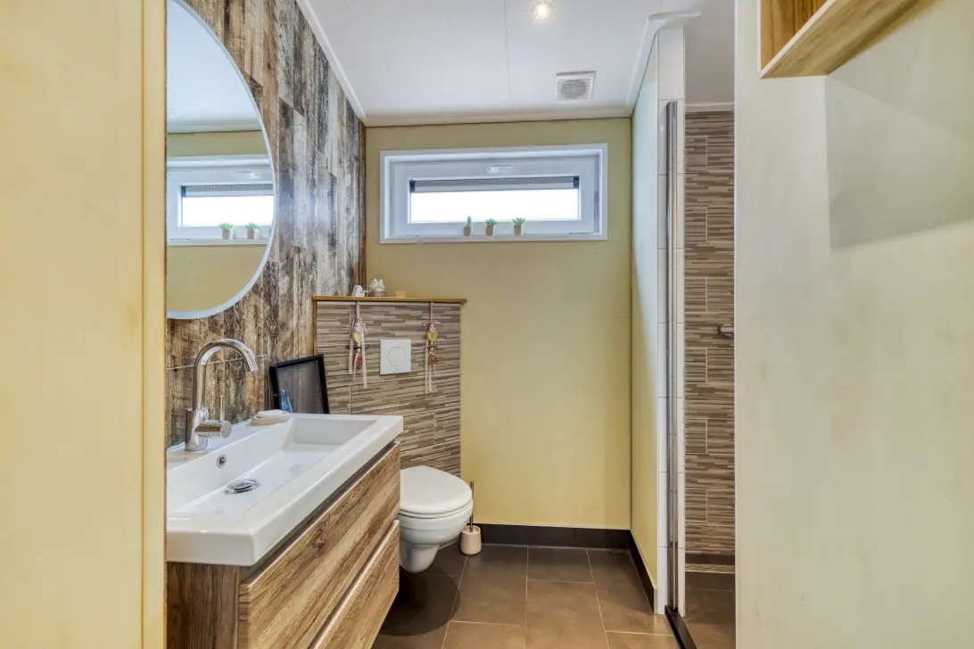 De badkamer is ook al zo mooi. Een donkergrijze vloertegel, designradiator. Mooie wastafel met brede wasbak en spiegel met verlichting! En een inloopdouche met regendouche. En een tweede toilet.