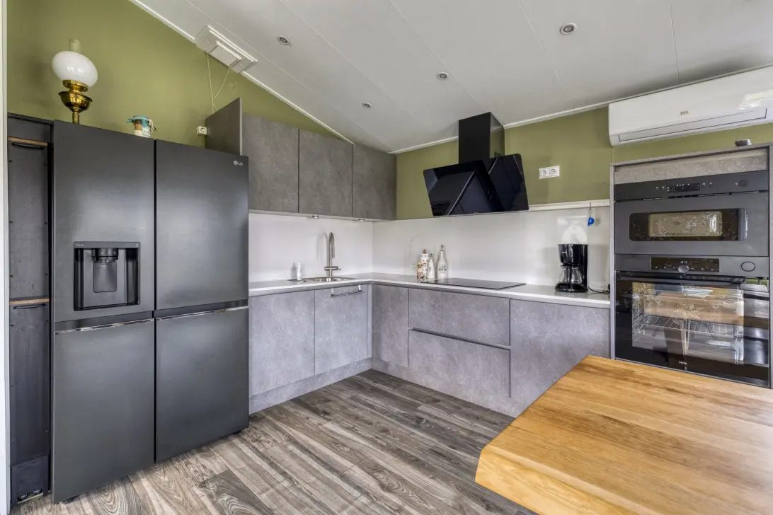 De luxe keuken is prachtig en zo goed als nieuw. Donkergrijze kastjes met een strak wit blad en vorzien van alle apparatuur.