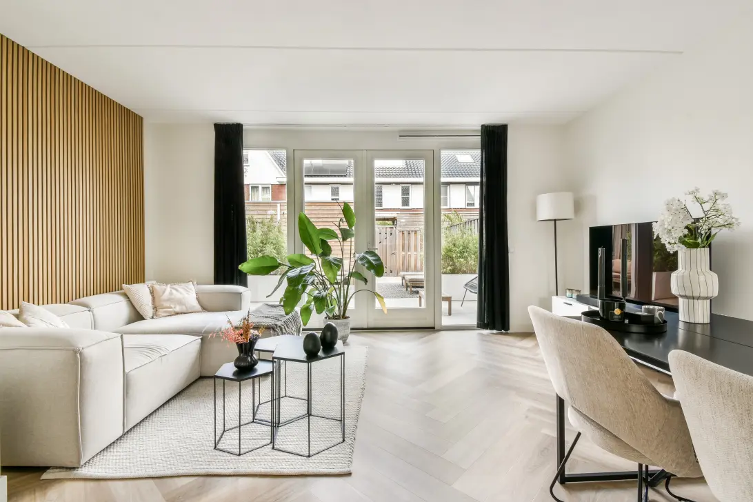 • Gezellige woonkamer met PVC visgraat vloer, veel lichtinval en openslaande deuren naar de achtertuin.