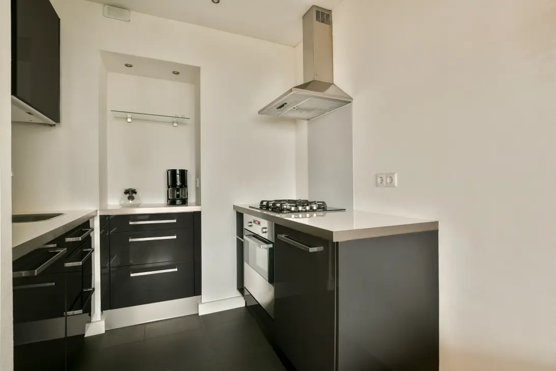 De compacte U-vormige hoogglans grijze keuken (2013) is voorzien van diverse inbouwapparatuur: een vaatwasser, kookplaat, koelkast en oven.