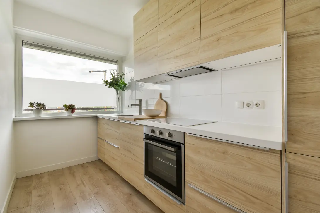 De moderne keuken is voorzien van diverse inbouwapparatuur waaronder een koel-vriescombinatie, een vaatwasser, een inductie-kookplaat, een recirculatie ventilatie kap en een oven. Het aanrechtblad is net als de tegels van de achterwand uitgevoerd in het wit en de keukenkastjes zijn in een lichte houttint uitgevoerd (fineer).
