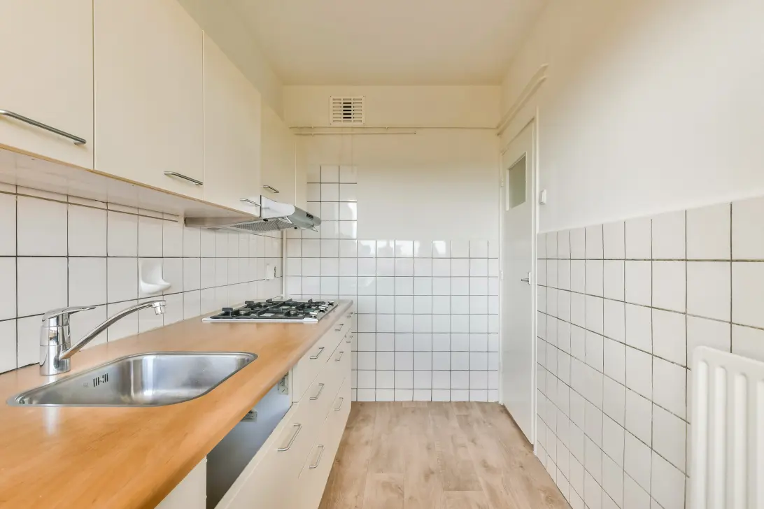 De keuken grenst aan de galerijzijde en is uitgerust met een in het vanille geel uitgevoerde keuken.