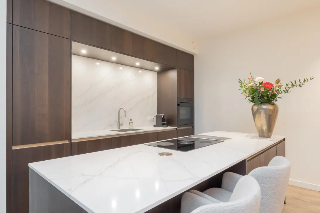 De moderne luxe keuken beschikt over een kookeiland en inbouwapparatuur, waaronder een Bora kookplaat met geïntegreerde afzuiging, vaatwasser, Quooker met bruisend water.