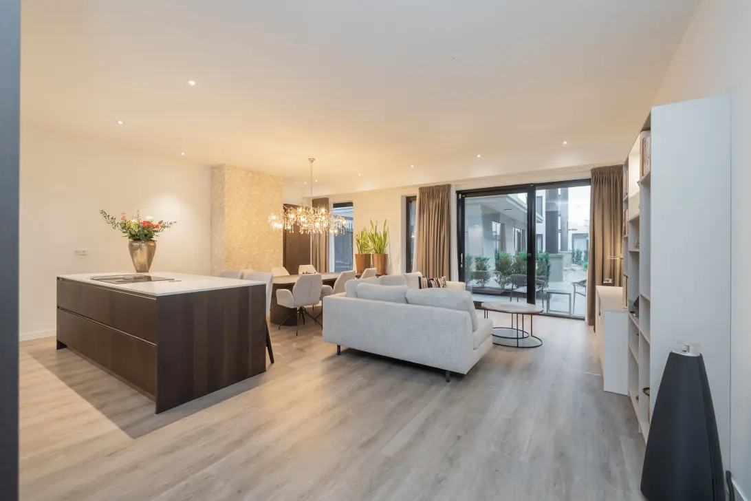 De entree geeft toegang tot de garderobe en meterkast. Vanuit de hal is de royale living van ca. 48m² met open luxe keuken bereikbaar. Een schuifpui leidt naar de terrastuin met uitzicht op de binnentuin.