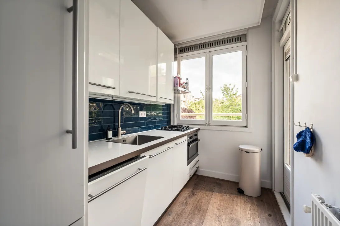 Bij binnenkomst via het verzorgde trappenhuis bereik je de eerste verdieping, waar je wordt verwelkomd door een royale, lichte woonkamer. De ruimte heeft een prettig formaat voor zowel een comfortabele zithoek als een ruime eettafel. De moderne, afgesloten keuken ligt aan de achterzijde en is uitgerust met diverse inbouwapparatuur, waaronder een koel/vriescombinatie, combimagnetron/oven en 4-pits gaskookplaat. Vanuit de keuken stap je direct het balkon op, gelegen op het noordoosten.