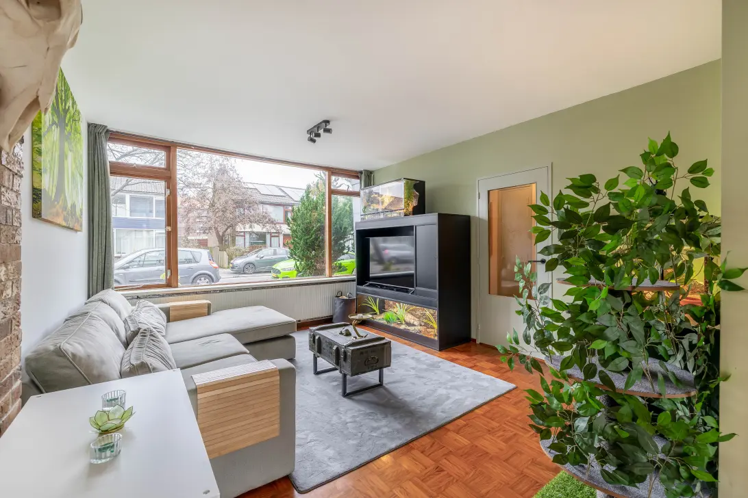 Verrassend is de indeling van de woonkamer en keuken met een gezamenlijk. Aan de voorzijde is de woonkamer, waar de glanzende parketvloer in blokmotief direct de aandacht trekt. En het achterste stuk van de woonkamer, met uitzicht naar de tuin? Dat is de plek waar de eettafel staat.