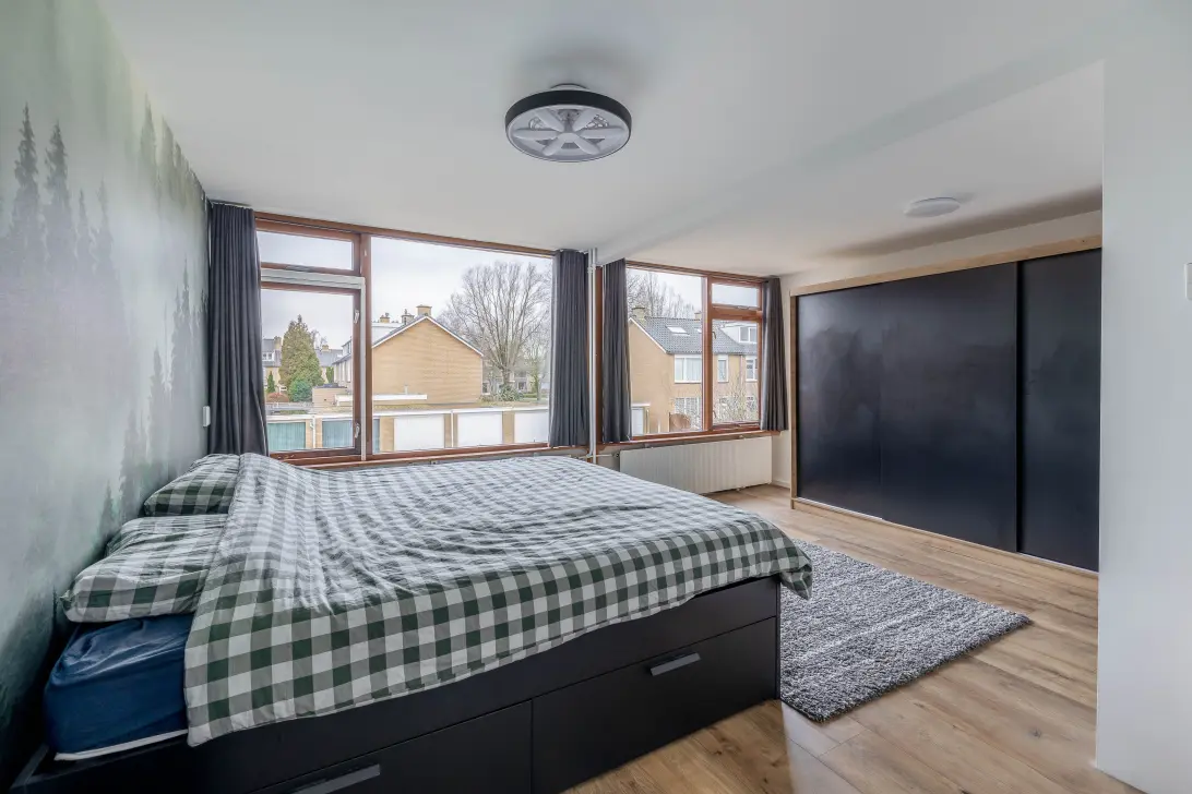 Op de eerste verdieping is de oorspronkelijke indeling grotendeels behouden. Alleen de muur tussen de slaapkamers aan de achterzijde is verwijderd, waardoor er een zeer ruime master bedroom is ontstaan. Aan de voorzijde zijn nog twee ruime slaapkamers, waarvan een met een inbouwkast.