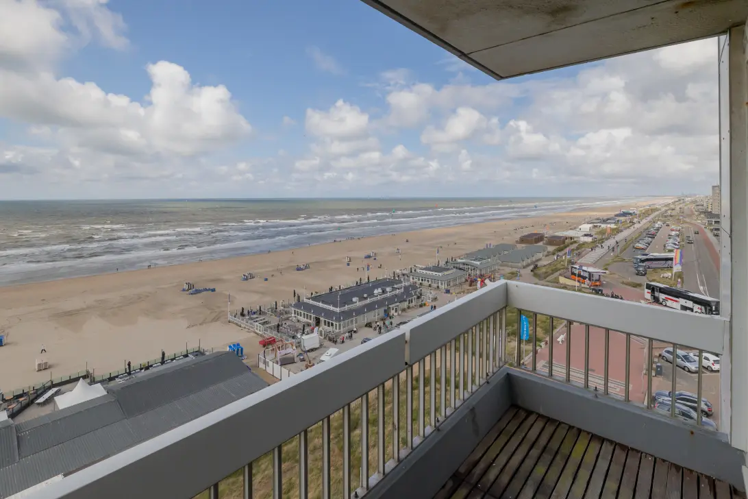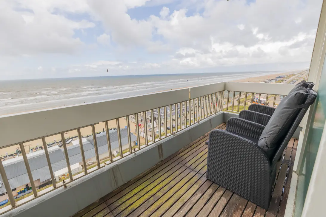 Aan zeezijde, pal op het zonnige westen, een een ruim balkon met geweldig weids uitzicht over boulevard, strand en zee.