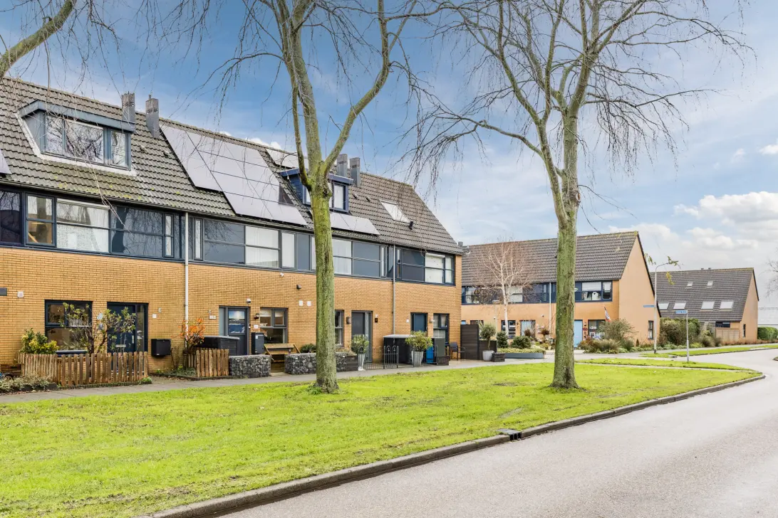 De woning beschikt over een voortuin grenzend aan een brede groenstrook en een ruime ca. 14,5 meter diepe achtertuin met een terras waar u tot laat op de dag van de zon kunt genieten. In de tuin staan meerdere fruitbomen, er is een ruime vrijstaande houten schuur met elektra en een praktisch achterom.
