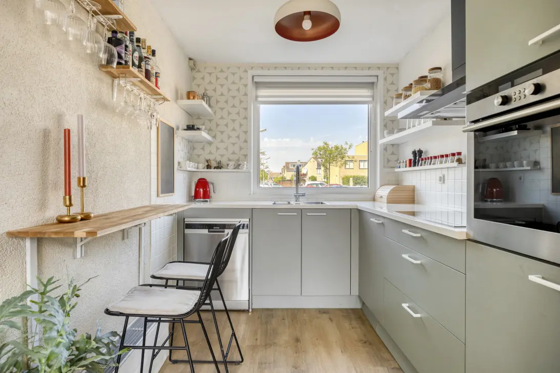Vanaf het eetgedeelte loop je zo de keuken in, die in augustus 2024 is vernieuwd. Er is gekozen voor een hoekopstelling in een lichtgroene kleur met witte greepjes en een wit aanrechtblad. De inductie kookplaat, afzuigkap en combi-oven zijn ingebouwd. De vaatwasser en dubbeldeurs koel-/vriescombinatie worden ter overname aangeboden. En het uitzicht? Door het grote raam kijk je ver de straat in en heb je goed uitzicht op de speeltuin!