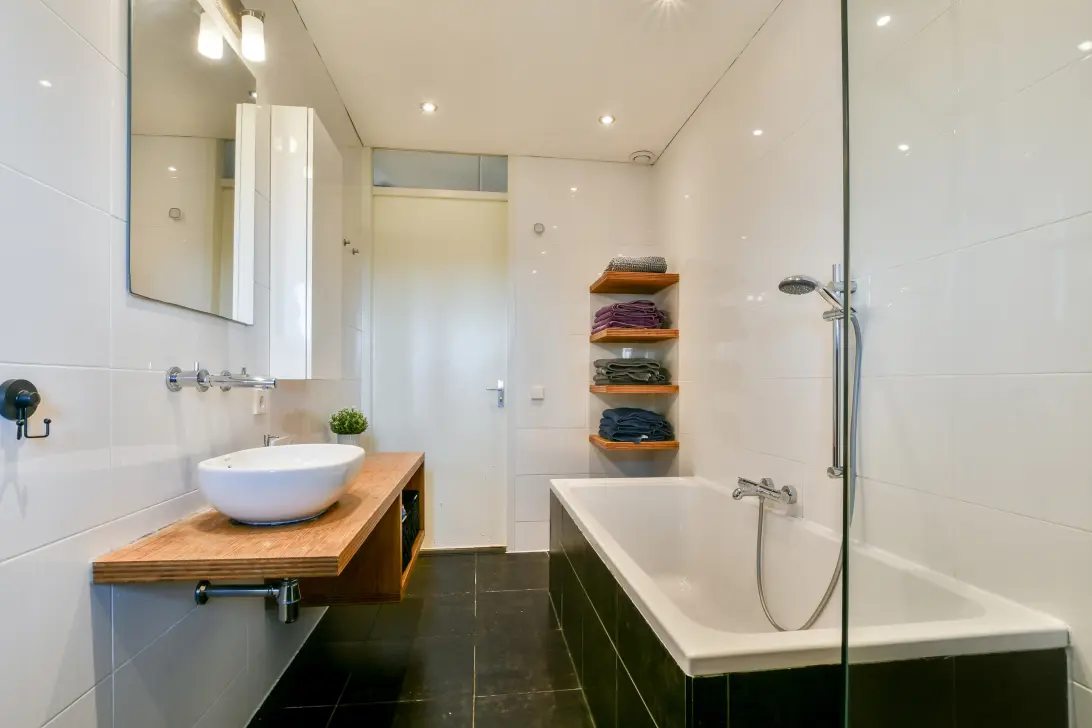 De gang geeft toegang tot de eerste en tweede slaapkamer en de royale badkamer, voorzien van ligbad, inloopdouche, handdoekenradiator en een wastafelmeubel. De derde slaapkamer grenst aan de woonkamer en kijkt ook uit op het Flevopark.