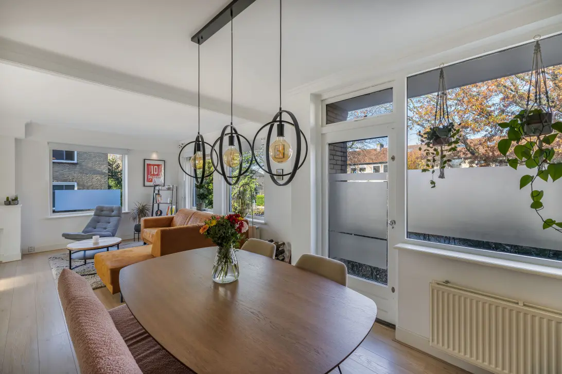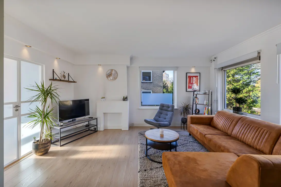 Aan het einde van de hal kom je in de lichte woonkamer, die zich uitstrekt over de voorzijde van het appartement. Dankzij de hoekligging valt het daglicht van twee zijden binnen, wat zorgt voor een open en uitnodigende sfeer. Hier heb je uitzicht over de levendige Ceintuurbaan, terwijl de goede isolatie zorgt voor een prettig en stil binnenklimaat.