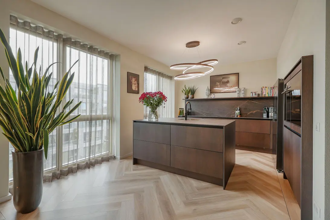 Then this highly sustainable (energy label A+++), move-in ready 2-bedroom apartment of approx. 133 m² is the perfect match. Situated on the fifth floor of the architecturally distinctive building The Twins, this apartment—with private storage unit and parking space in the garage—offers a unique combination of style, comfort, and convenience. The ground lease has been paid off until 2069 and converted into perpetual leasehold.