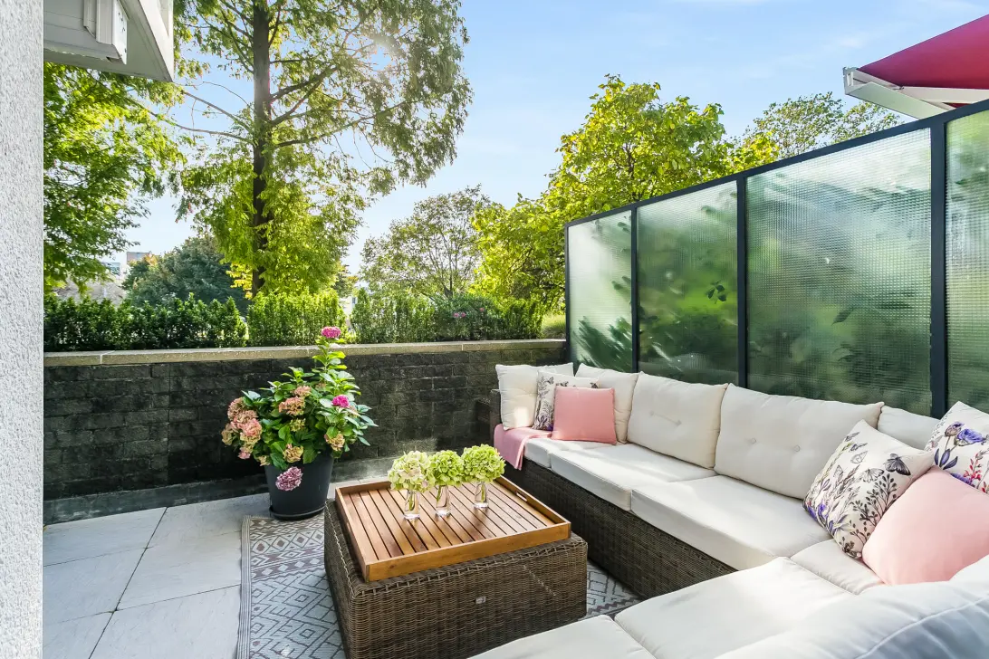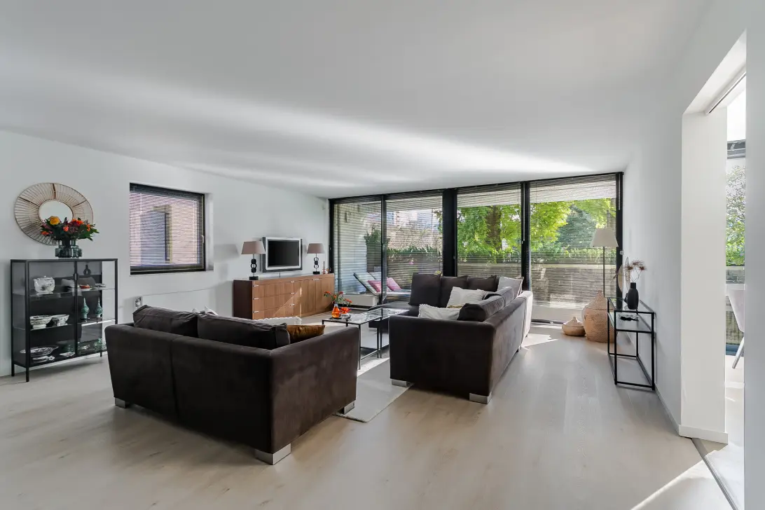 From both the living room and open-plan kitchen, you can access the expansive south-facing terrace of approximately 26 m²—perfect for soaking up the sun. Electric awnings provide comfort even on warmer days.
