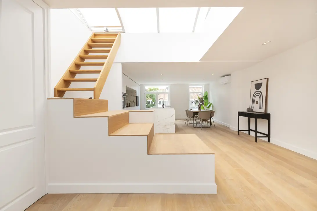 De moderne open keuken is volledig uitgerust met inbouwapparatuur, waaronder een inductiekookplaat, combi-oven, vaatwasser, koelkast en wijnklimaatkast. Het kookeiland met bar biedt een fijne plek voor een snel ontbijt of een goed glas wijn tijdens het koken. Aansluitend vind je de eethoek en de sfeervolle woonkamer, waar het licht van meerdere kanten binnenvalt en de zichtbare spanten zorgen voor een unieke sfeer.