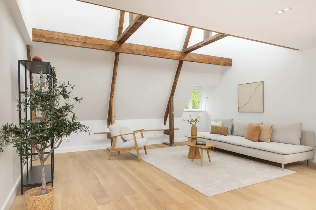 Via het nette trappenhuis bereik je de woning op de vierde verdieping. Wat direct opvalt is de ruimtelijkheid, de lichtinval door de diverse dakramen en de strakke afwerking in combinatie met de authentieke balkenconstructie.