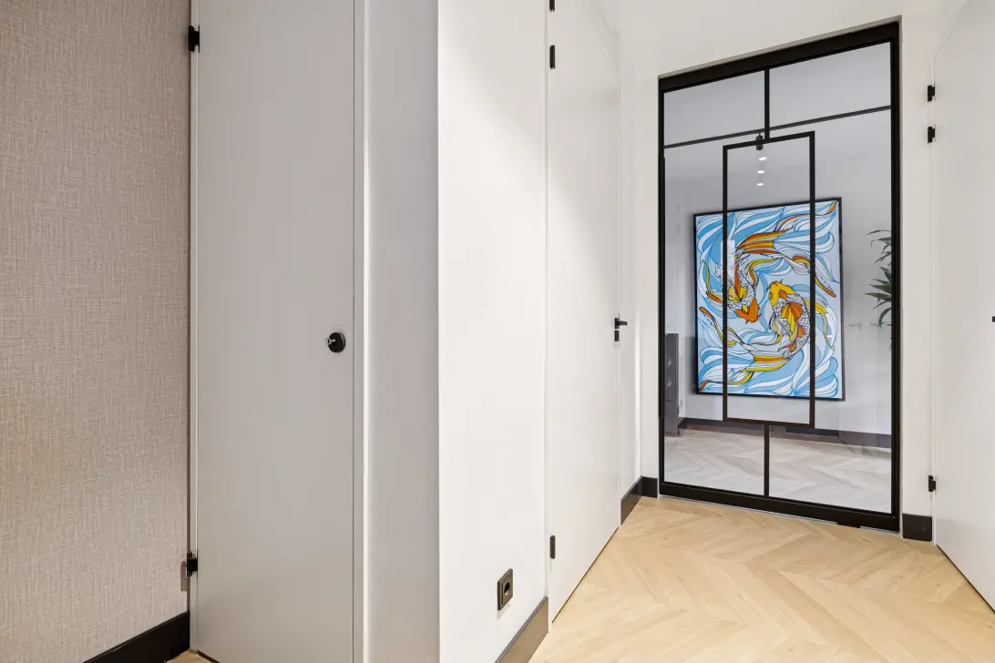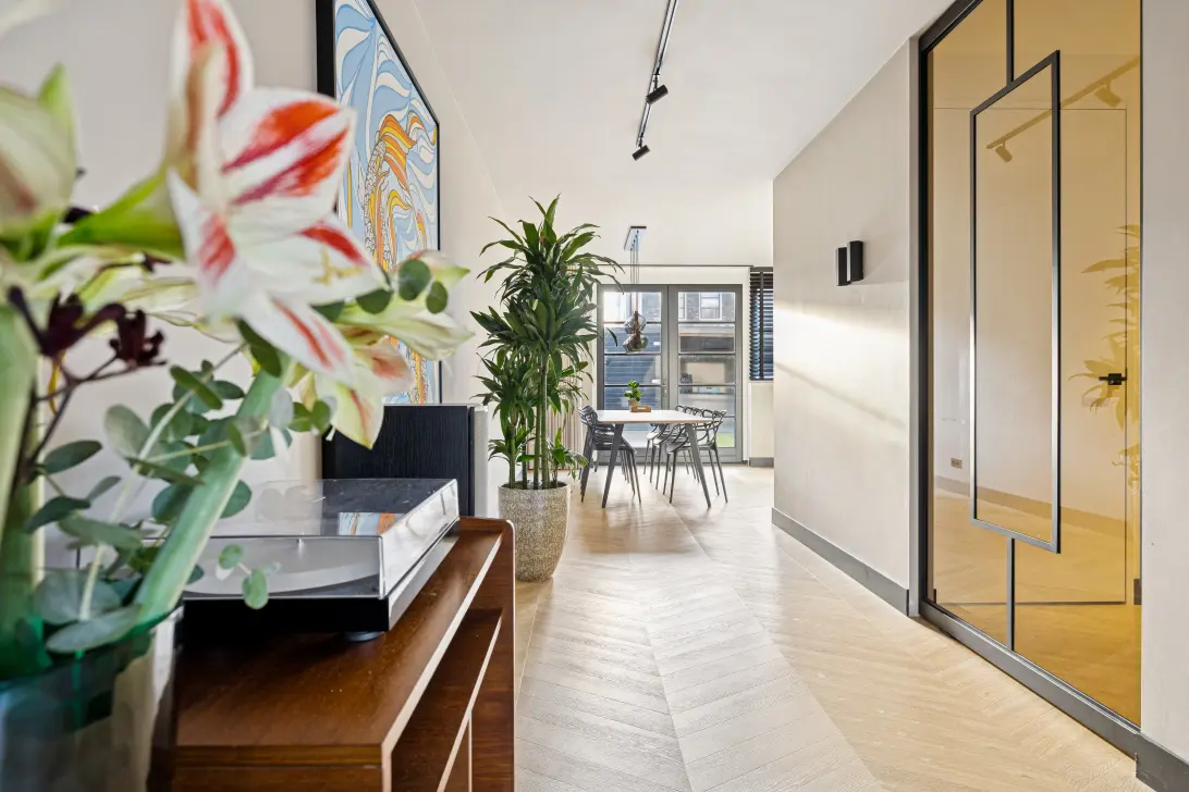 Middels een speciale stalen taatsdeur krijgt u toegang tot de sfeervolle woonkamer aan de voorzijde van de woning.
