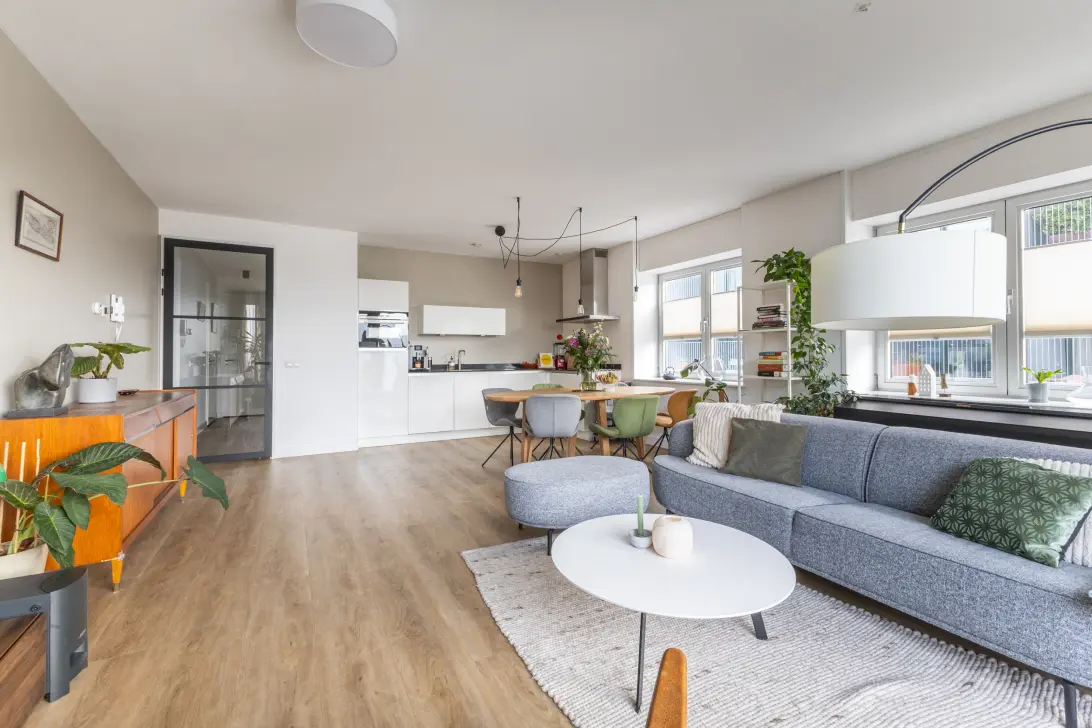 Je komt binnen in de hal met toilet. Vanuit hier stap je de woonkamer in - en die is echt heerlijk licht. Dankzij de ligging op de hoek stroomt het daglicht van twee kanten naar binnen. De strakke PVC-vloer, glad gestuukte wanden en het gespoten plafond zorgen voor een rustige, moderne basis waar elke woonstijl tot z’n recht komt.