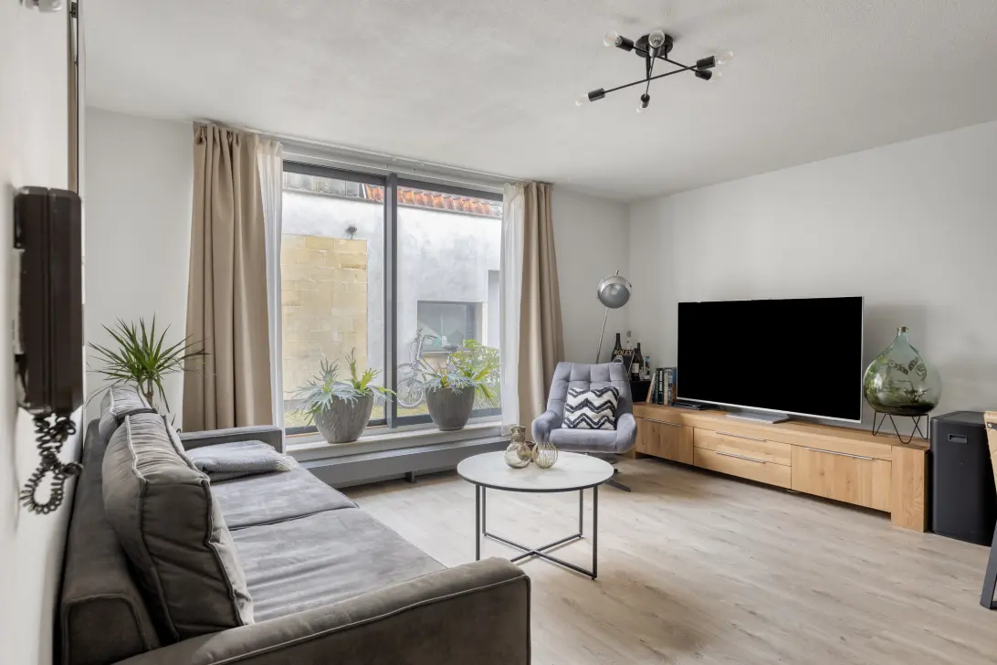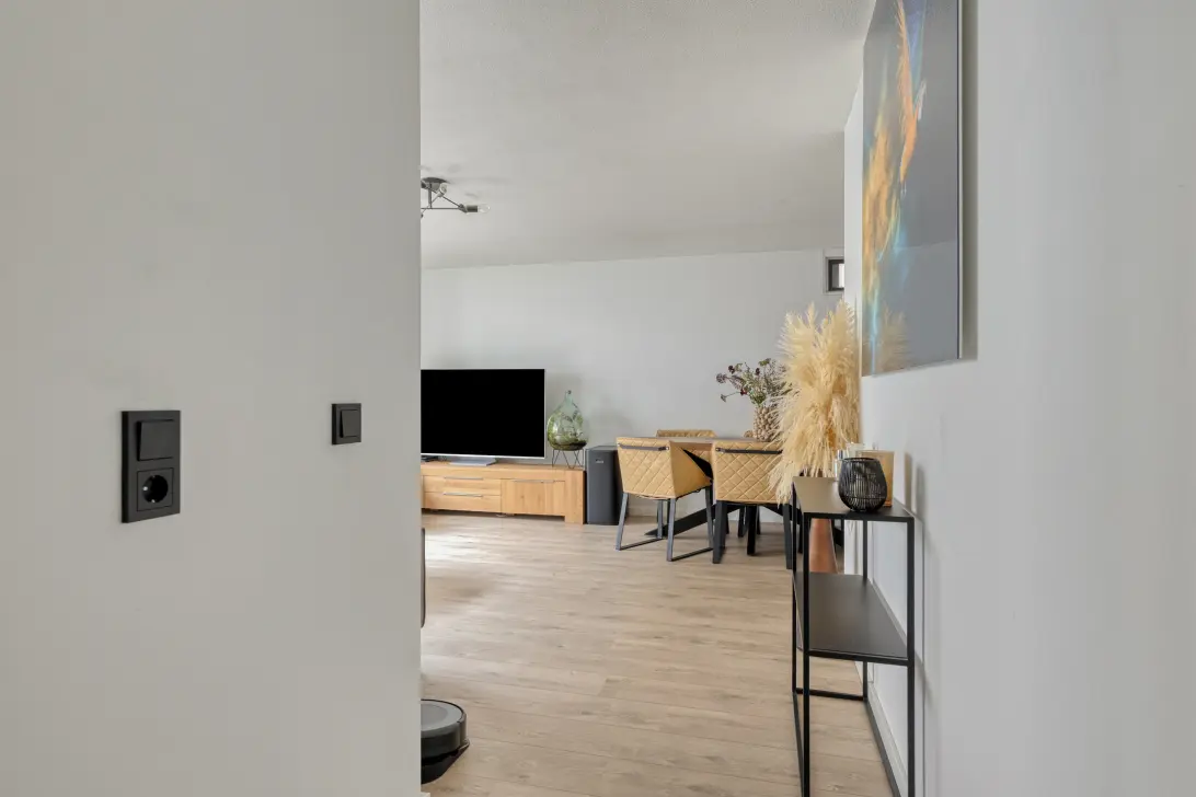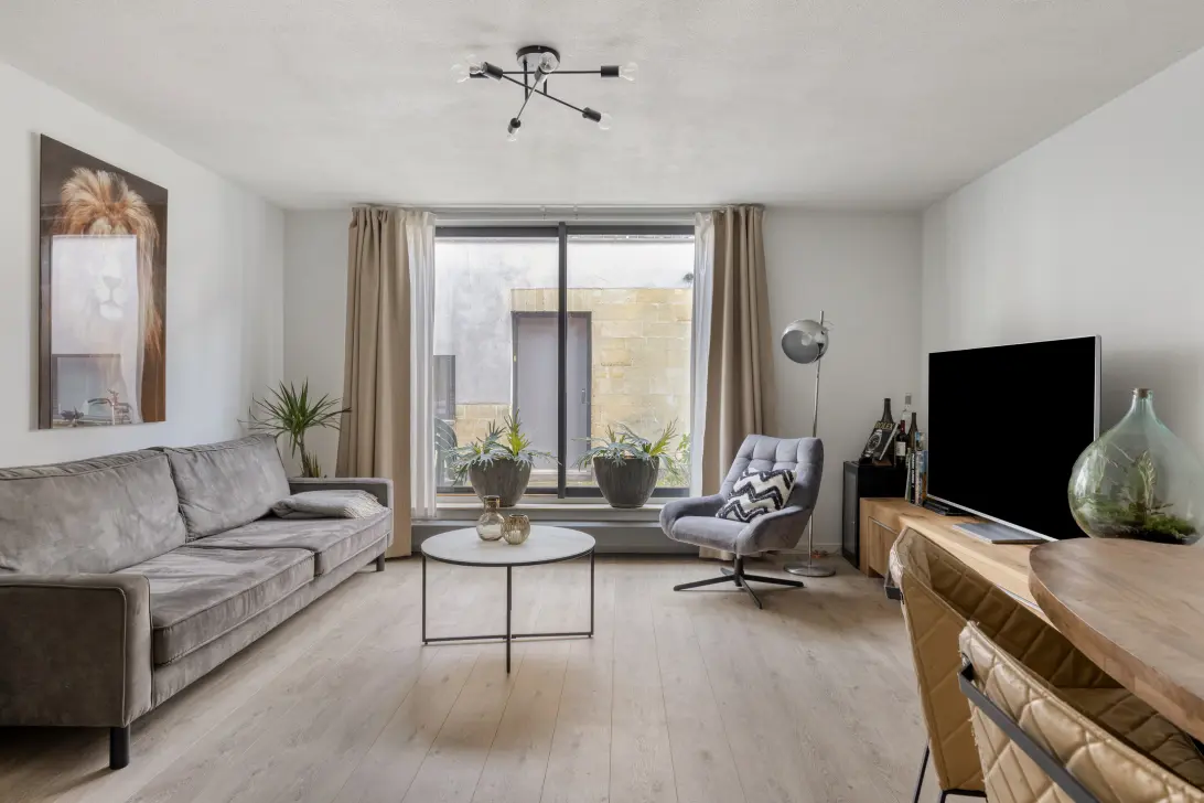 Je komt binnen in een strak afgewerkt appartement met een fijne, ruime woonkamer en een open keuken. De grote schuifpui laat niet alleen veel daglicht binnen, maar geeft je ook een heerlijk buitengevoel. Op zonnige dagen kun je hier eenvoudig een gezellig zitje creëren.
