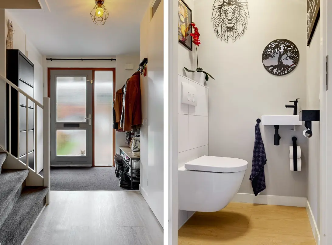 Via de ruime voortuin kom je in de hal met meterkast en toilet. De lichte woonkamer is dankzij de uitbouw en grote dakramen heerlijk ruim en licht. De vloer is voorzien van vloerverwarming, wat zorgt voor optimaal comfort. De open keuken (2018) heeft een moderne uitstraling en is uitgerust met een inductiekookplaat, afzuigkap, aparte koelkast en vriezer, vaatwasser en combi-oven. Via de openslaande deuren bereik je de achtertuin op het noordoosten, met berging en achterom.