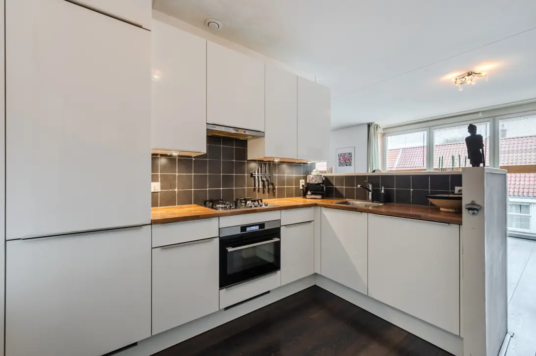 De halfopen keuken is geplaatst in 2017 en uitgevoerd in een hoekopstelling. De keuken heeft een mooi design met witte keukenkastjes, een zwart achterblad en een houtkleurig werkblad. Hier tref je de volgende apparatuur aan: vaatwasser, gasfornuis, afzuigkap, oven, koelkast en vriezer. Via de keuken heb je toegang tot een berging met daarin de aansluitingen voor de wasmachine en droger.