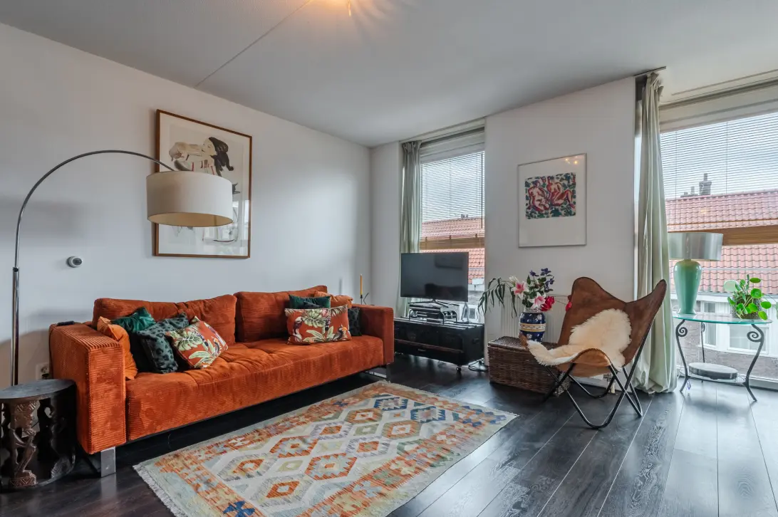 Na binnenkomst kom je terecht in een langwerpige entreehal met de meterkast, die toegang biedt tot meerdere vertrekken. De woonkamer vormt het hart van het appartement en is fraai afgewerkt met een donkere vloer en glad stucwerk op de wanden. Meerdere hoge ramen zorgen hier voor een geweldige lichtinval.