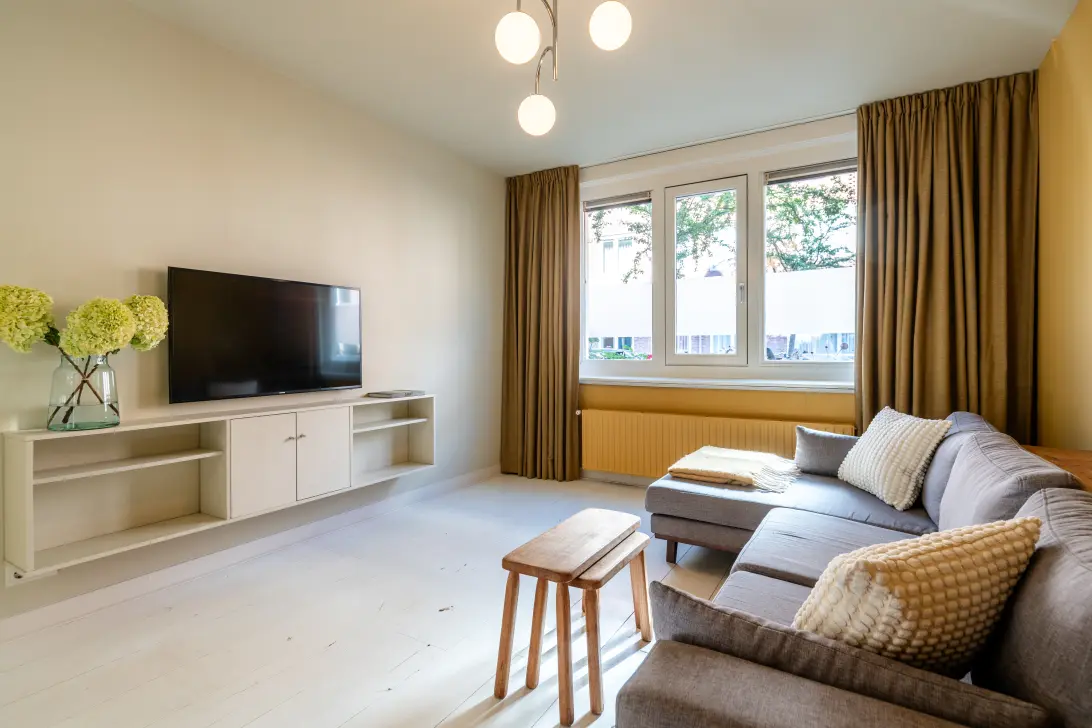 Eigen entree met ruime hal en separaat toilet met fonteintje. Aan de voorzijde ligt de woonkamer, die toegang geeft tot de eerste slaapkamer. Aan de achterzijde bevindt zich de woonkeuken, met voldoende ruimte voor een eettafel en openslaande deuren naar de tuin. De tweede slaapkamer ligt ook aan de achterzijde en heeft eveneens toegang tot de tuin. De moderne badkamer is voorzien van een inloopdouche en dubbele wastafel.