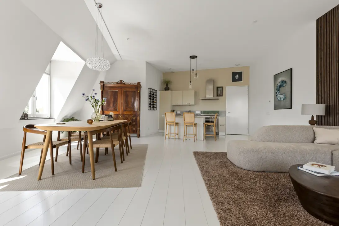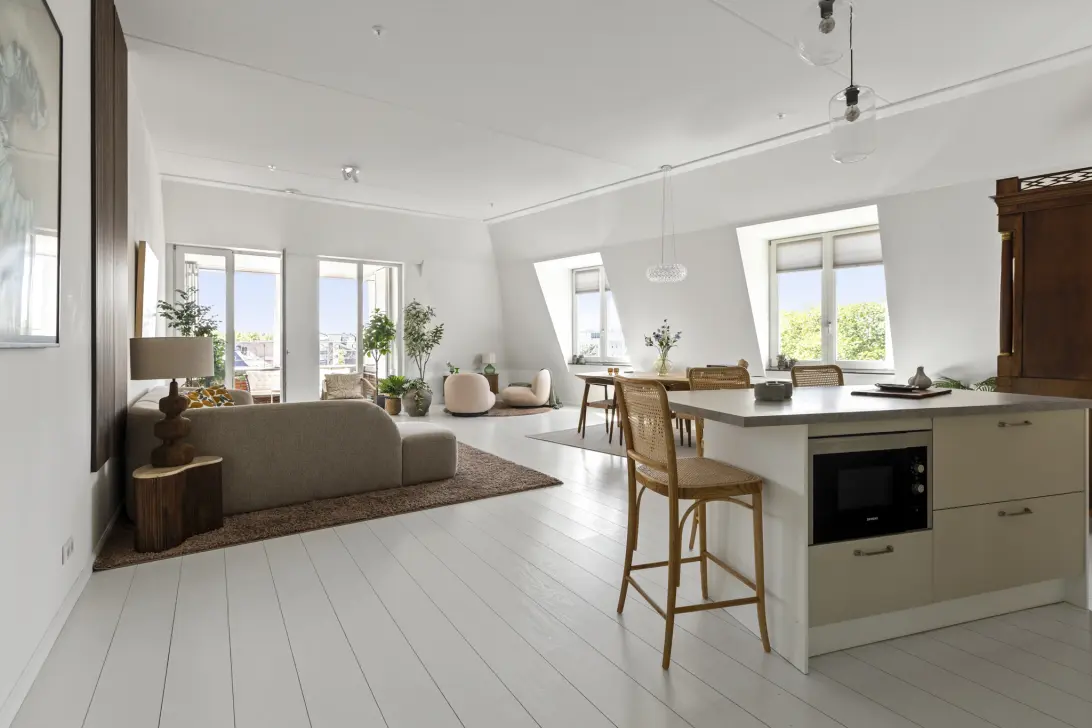 The apartment is located on the fourth (and top) floor, also called the penthouse and is accessible via a well-maintained stairwell or a modern elevator. At the front is the spacious living room with a modern open kitchen and cooking island. Thanks to the high ceilings and large windows, this room is particularly light. From the living room you step directly onto the balcony with unobstructed views over the water, the Maritime Museum and the mill.