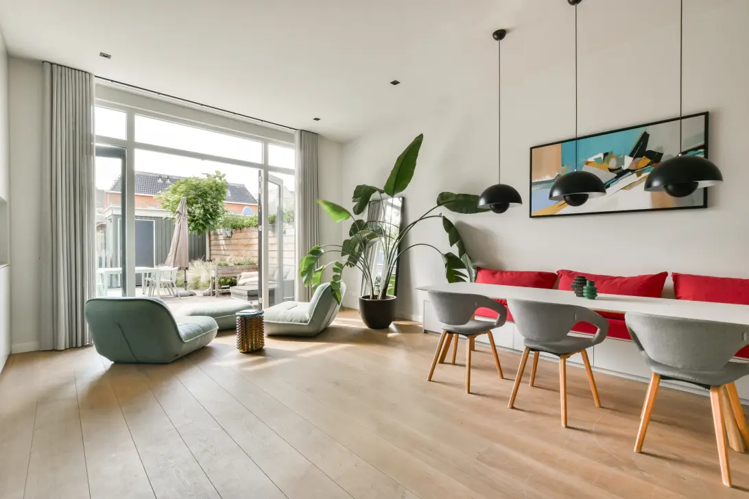 Uniek detail: in de eethoek loopt een maatwerk dressoir met geïntegreerde bank over de hele diepte van de woning – praktisch én sfeervol.