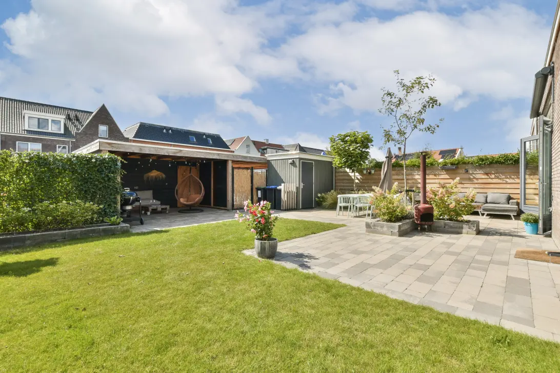 De zonnige tuin op het zuiden voelt heerlijk vrij, met altijd plek in zon of schaduw. Onder de royale overkapping geniet je tot in de late uurtjes. Extra’s zoals de dubbele berging en de carport maken het helemaal compleet.