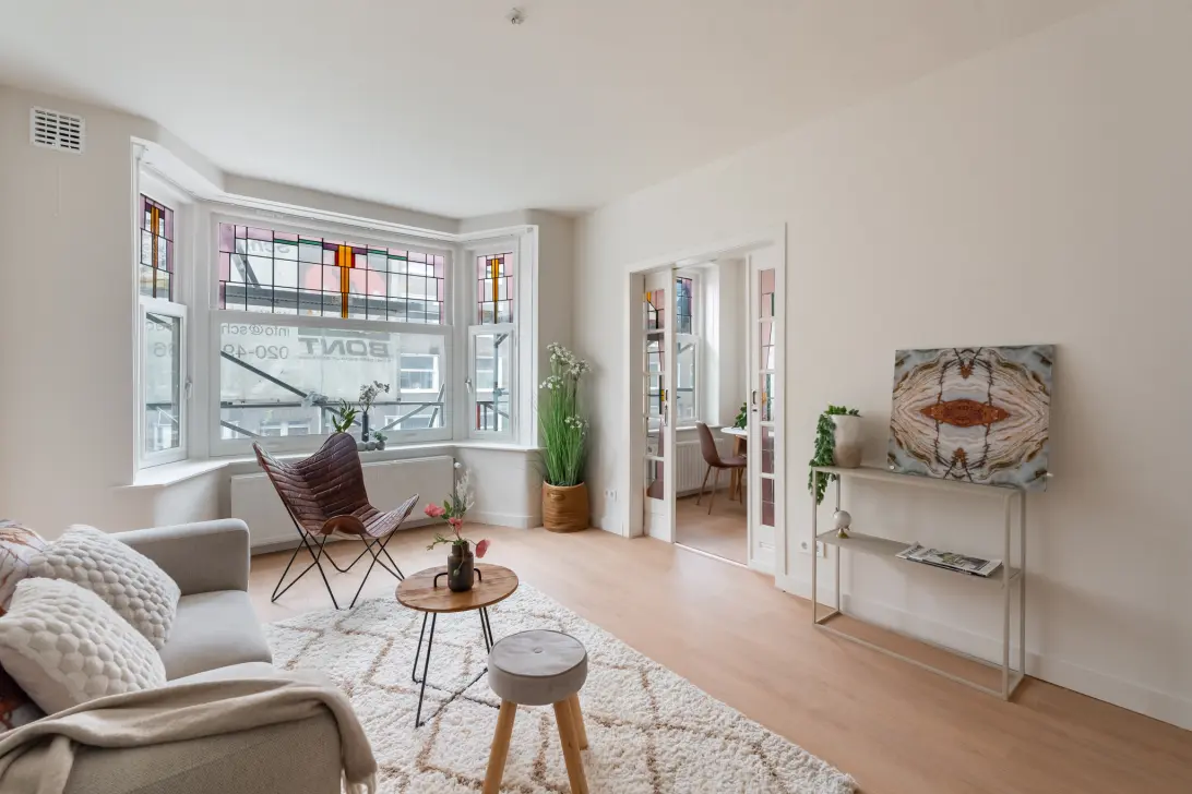 Op de eerste verdieping kom je binnen in de ruimtelijke hal. Aan de voorzijde van de woning vind je de lichte woonkamer voorzien van een charmante erker met glas-in-lood ramen. De prachtige glas-in-lood en suite schuifdeuren bieden toegang tot de zijkamer. Deze is ideaal te gebruiken als eetkamer, kantoor of als derde slaapkamer.