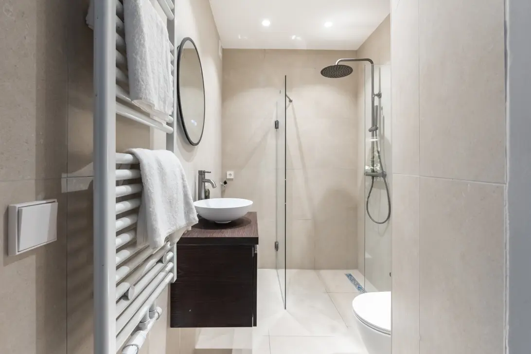 De goed ingedeelde volledige gerenoveerde badkamer bevindt zich in het midden van de woning. Deze beschikt over een inloopdouche, toilet, wastafelmeubel en de wasmachine aansluiting.