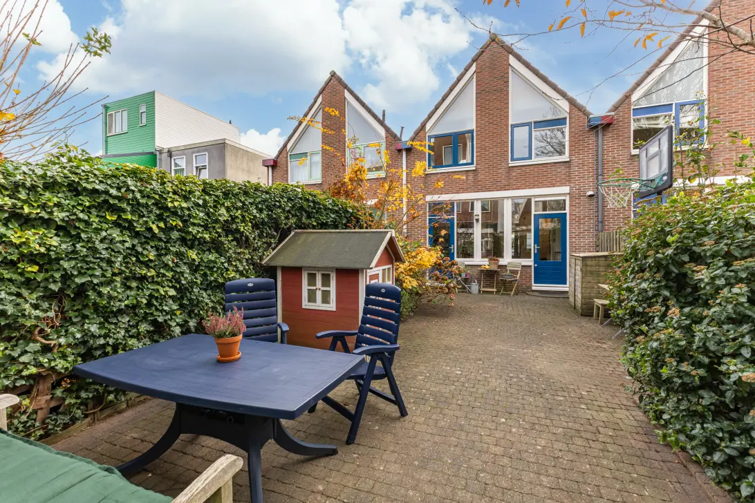 De tuin is toegankelijk vanuit de keuken en tevens via een achterom. De tuin ligt op het noordwesten en biedt een prettige mix van groen en bestrating. De grote houten berging met betonnen fundering biedt plaats aan fietsen, speelgoed en tuingereedschap en er is voldoende ruimte voor een vriezer. Een klein gedeelte van de tuin (7m2) wordt voor € 100,- van de gemeente gehuurd. Er is een mogelijkheid om dit huurcontract over te nemen of af te kopen.