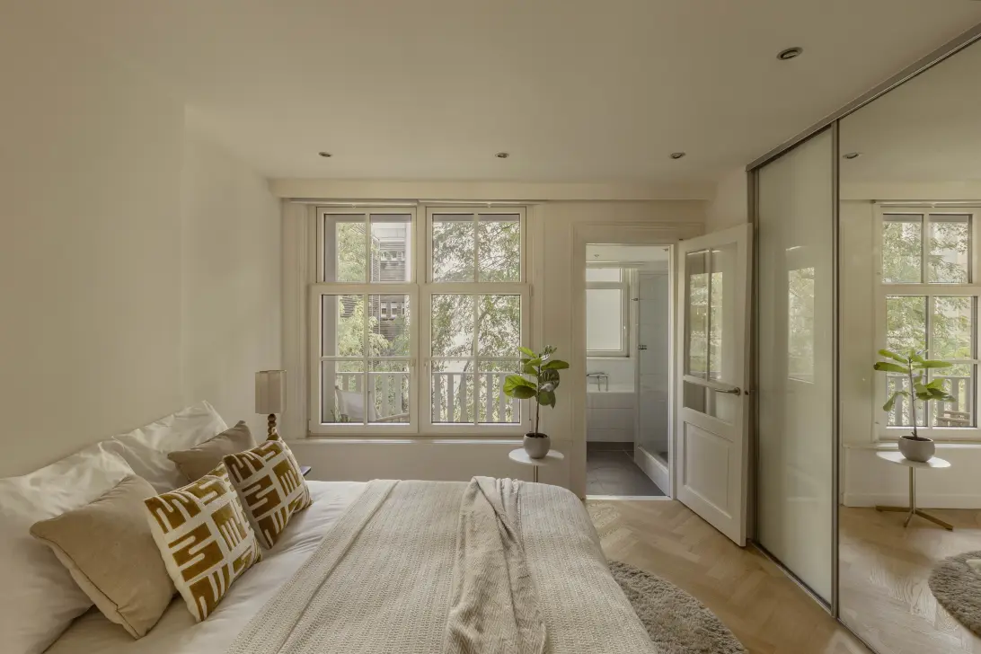 Aan de achterzijde bevindt zich de slaapkamer, voorzien van ingebouwde kasten en een en-suite badkamer met inloopdouche, ligbad en wastafel. Twee karakteristieke ramen zorgen voor prettig daglicht en bieden uitzicht op het balkon en de groene binnentuinen. Het toilet is separaat.
