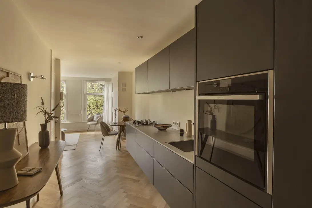 In het midden van de woning is de open keuken gesitueerd, uitgevoerd met een Next125-keuken en Siemens inbouwapparatuur (2018). De open haard vormt een centraal element in de ruimte en het appartement is voorzien van vloerverwarming.